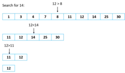 A binary search requires that the data is sorted prior to being searched through. It begins by splitting the list of data in half and determining which half contains the value required. The half which does not contain the required data is disregarded, and the process repeats until the value is found.