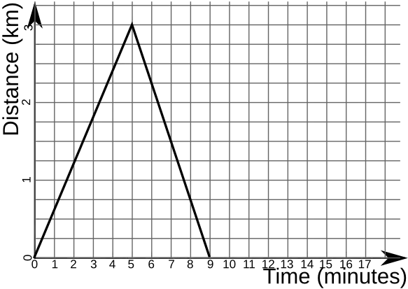 5. A car travels at 10ms−1 for 5 minutes in a straight line, and then returns to its original location over the next 4 minutes, travelling at a constant velocity. Draw a distance-time graph showing the distance the car has travelled from its original location.