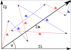 where a1 ... an are the vectors to be added together, i1 ... in are their horizontal components, j1 ... jn are their vertical components, and θ is the angle between the θ=0 line and the resultant vector Σan, as shown in the diagram on the right.