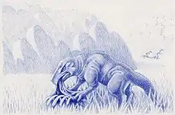| Cave paintings showing Javan rhinoceros wearing a business suit screaming aloud with hands on the cheek while seeing the stock price crash.png |