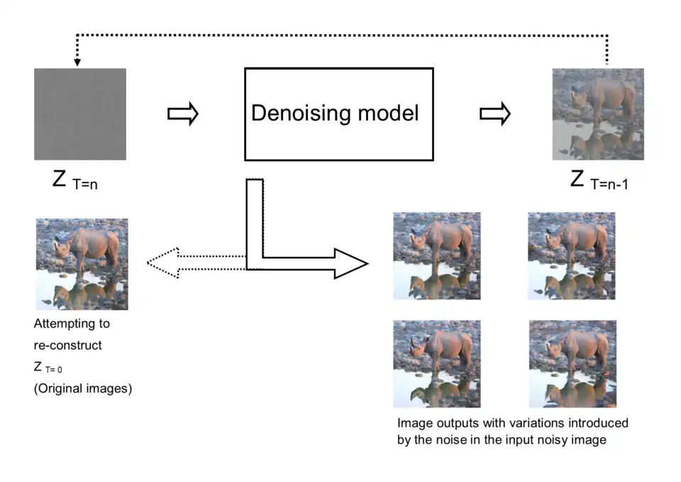 In this example, we have an image of Rhino by the rocky riverbed for example. From T=0 (The original images) , forward diffusion model will add more and more noise consecutively for each steps (T) until the images is virtually unrecognisable. Although it seems counter intuitive, this whole process will teach forward diffusion model will teach denoising diffusion model on how to remove noise from an images.
