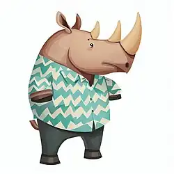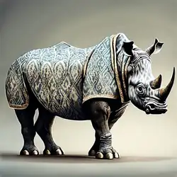 The prompt used is Anthropomorphic rhinoceros standing on two feet, wearing shirt with <<Pattern's Name>> pattern