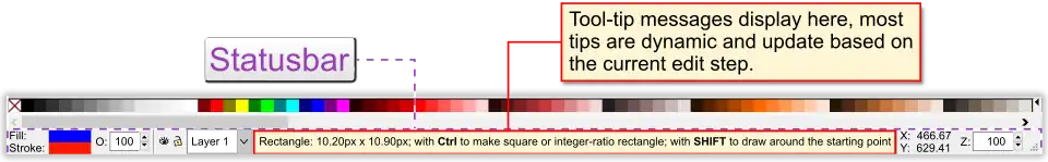 Command keys (Ctrl, Shift and Alt) based Tool-Tip messages can be read at the bottom center of the user interface in the Statusbar. The tool tips are dynamic and will change based on (1) current edit being performed (2) mouse-over 🖰 of one the shape handles (3) press and hold one of the three command keys (Ctrl, Shift and Alt) will update with the associated tool tip, i.e., while in the Rectangles and Squares tool hold the Ctrl key and the tool-tip message will update.
