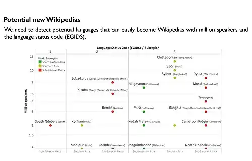 One of the core challenges facing Wikipedia's linguistic diversity is the content gap. This gap arises when articles on geographical and cultural topics exist in larger language editions but are absent in minoritized language editions. Marc Miquel presents potential languages that can easily become Wikipedias in the Celtic Knot Wikimedia Language Conference 2019 including Sylheti.