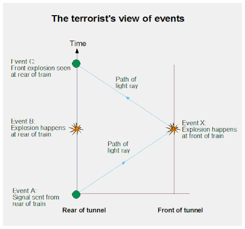 What does the train driver think of all this? He reasons (quite correctly) that at the instant that (to him) the back of the train enters the tunnel he will be well out of the tunnel and in no danger of being trapped inside by the simultaneous explosions but, as he approaches the tunnel, he is horrified to see the terrorist (whose clock appear to be going so s-l-o-w-l-y) set off the light signal far too early. What is more, the tunnel is so short the light signal takes no time at all to get to the far end and the explosion goes off just before the engine reaches the end of the tunnel. Meanwhile, the back of the train (which to the engine driver appears not to have yet entered the tunnel) continues to move as if unaware of the carnage ahead and, at the instant the last carriage enters the tunnel, the second explosion goes off and the terrorists triumph is complete!