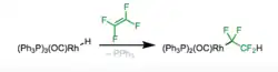 4. Migratory insertion is another method to synthesize alkyl complexes, resulting in an addition across pi bonds, as shown in figure 5. Certain alkyl complexes can be synthesized this way. For instance, the perfluoroalkyl complex is stable and so, fluoroalkenes insertion is generally favorable compared to elimination (take note of the figure on the right).