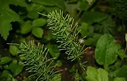 Horsetails, like club mosses and ferns bear spores rather than seeds. Horetails are in the order Equisetales which consists of a single family called Equisetaceae. There are 15 species in this order.