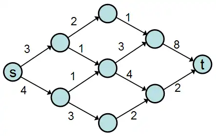 We assign a "capacity" to each edge, and initially we'll consider only integral-valued capacities. The following graph meets our requirements, where "s" is the source and "t" is the destination: