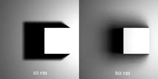 This is a Top view of a Box that is positioned just below and to the left of the light source. Notice that the shadow on the 60 cm Width Light appears to have a gradient on it unlike the nearly solid black shadow of the 10 cm Width Light. To get rid of the gradients, turn up the ray casts, and turn on multipass.