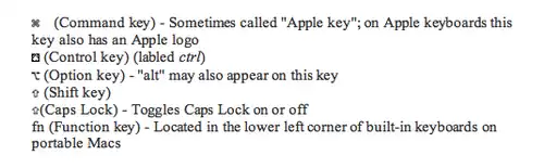 - ↑ a b Mac OS X keyboard shortcuts (2009), Article HT1343, Retrieved July 20, 2009 from http://support.apple.com/kb/HT1343