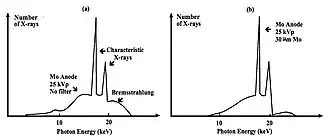 - Molybdenum (Mo) can be used instead of tungsten as the anode material in the X-ray tube (XRT). The Mo energy spectrum consists of K-Characteristic lines between 17 and 19 keV and a Bremsstrahlung continuum - see Figure 7.22. The Bremsstrahlung can be attenuated using an added Mo filter which preferentially eliminates the low energy radiation, that would otherwise be completely absorbed by the tissues and contribute little to image formation, as well as higher energy X-rays which would otherwise degrade subject contrast. This is an example of the application of K-edge filtration.