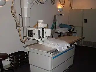 Applications areas include the oesophagus, stomach and colon (using barium-based contrast media) as well as phlebography, myelography and vascular studies (using iodine-based contrast media), urology and weight-bearing skeletal studies. Generally, the XRT, image receptor and patient table are attached to each other mechanically - see Figure 1.20 - although it is also possible for the XRT and receptor to be mounted on a structure such as a C-arm - see this photo - to allow improved flexibility.