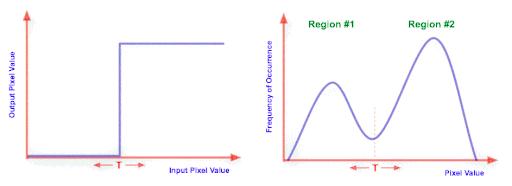 - Here some property of an image is compared to a fixed or variable threshold on a pixel-by-pixel basis. A simple example is a grey-level threshold where a look-up table (LUT) of the form illustrated in the left hand panel of Figure 5.13.5 is applied, and where the value of the threshold, T, can be adjusted interactively.