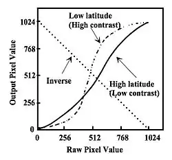- More sophisticated look-up tables can be used for more subtle effects. Figure 5.7 shows examples for high and low latitude displays and an inverted grey-scale is also illustrated, where dark pixels can be preferentially boosted and bright pixels are suppressed.