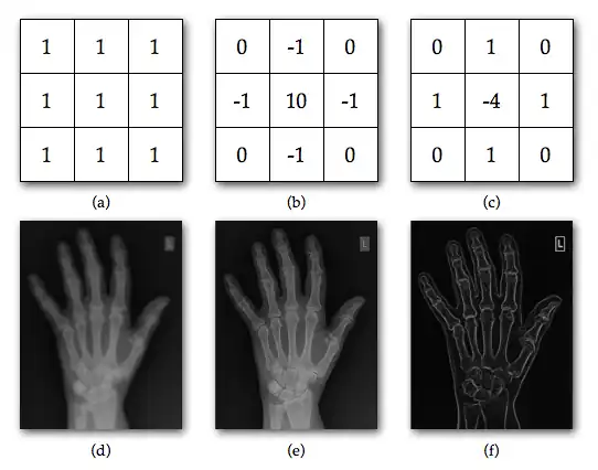 - On this basis, the value of each pixel is combined with the values of its nearest neighbouring pixels to form the filtered image as illustrated in Figure 5.11. The process is sometimes referred to as image convolution and the mask is referred to as a convolution filter or kernel. Note that larger masks can be defined depending on the application, e.g. 5x5, 9x9 arrays of weighting factors.