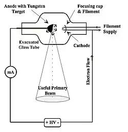 An XRT in its simplest form consists of an anode and cathode mounted inside an evacuated glass tube - see Figure 2.1. The cathode generally consists of a small coil of wire, called a filament, mounted in a focusing cup. The anode target is generally made from tungsten separated from the filament by a small gap, although molybdenum and rhodium targets are used in Mammography. Electrons are boiled off the filament by applying an electric current so that it becomes white hot - the process is called Thermionic Emission. A high voltage (HV) of up to 100 kV or more is then applied and the electrons are attracted across the gap to collide with the anode at high energies, to produce X-rays. Bremsstrahlung and Characteristic Radiation processes are involved here, as previously described. The focusing cup can be used to form the electrons into a narrow beam and hence only strike a small spot on the anode target. X-rays are produced in all directions from this focal spot, but beam restriction devices (e.g. collimators; not shown in the figure) are used to allow only a primary beam to escape the source and irradiate the patient.