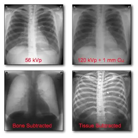 A chest radiograph acquired at 56 kVp is shown in the top left panel of the figure. This is referred to as a low energy image. In the top right panel is a radiograph of the same patient's chest acquired at a high energy – 120 kVp, with 1 mm copper filtration. Results of the dual-energy processing are shown on the bottom row. The bone-subtracted image is shown in the bottom left panel and the tissue-subtracted image in the bottom right panel. Notice that the tissue-subtracted image demonstrates that the lesion in the patient's left lung is a calcified nodule, since it doesn't appear in the bone-subtracted image.