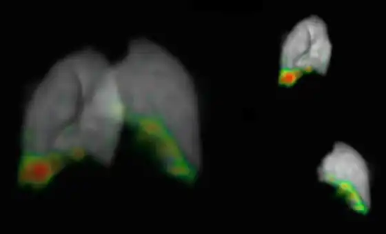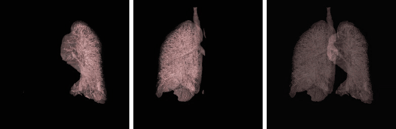 The following set of images will be used to help us with our task. They consist of a SPECT lung-ventilation study, illustrated by the animated sequence on the left, a SPECT lung-perfusion study, in the middle, and a CT pulmonary angiogram (CTPA) from the same patient on the right:
