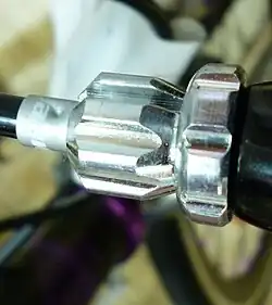 - Barrel-adjusters: These fittings are most often sold as a part of a brake lever, a gear shifter, or a derailleur, but they are sometimes supplied as accessories for the middle of a cable run. The adjusters on handlebars can be adjusted while pedalling so are more convenient than those installed elsewhere on the bike. In any case, all barrel-adjusters must be able to loose-fit a housing ferrule in their ends, and since housings and ferrules exist in both 4 and 5 mm sizes, it is important to make sure that any ferrule used will not bind there.