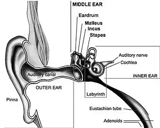 The sounds are collected by the pinna, the visible part of the external ear and guided to the middle ear by the external auditory canal, a deceptively simple tube. The ear canal amplifies sounds between 3 and 12 kHz. At the far end of the ear canal is the tympanic membrane, which marks the beginning of the middle ear.