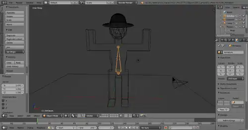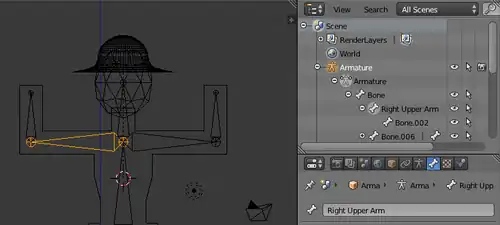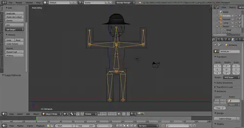 Noob Note: If you've been adding bones to your simple person from the previous lessons, you will have likely noticed that the hat seems to stretch when you move the arms in pose mode. To fix this, you will need to remove the hat from the forearm vertex groups created in the Parenting step.