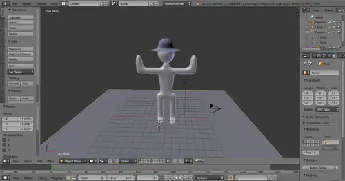 Here's our setup, with Block Dude standing on a plane. You can add a plane by pressing Shift + A → Mesh → Plane. Scale the plane to an appropriate size and move it so that it is approximately underneath the person.
