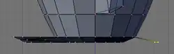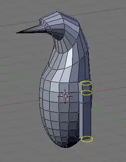 Select the three middle vertices in the second row up from the bottom. Then, switch to the side view ( NUM3 ) and extrude the edges 0.3 units away from the penguin and 0.08 units down ( E → Edges), so that the end of the tail is at the same level as the bottom of the penguin.
