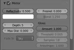 Just below the Transparency panel in the material settings, you will see the Mirror panel. Check the box at the top to enable it. Note the “Reflectivity:” editable field just below the checkbox; you will need to set this to something other than its default of 0.0 in order to actually observe any mirror effect.
