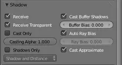 settings, look for the Shadow panel. Note the two checkboxes at upper left: by default the “Receive” one is checked, the “Receive Transparent” one is not. Check the latter as well. Now any object surface with this material assigned will have proper non-transparent shadows computed as appropriate.