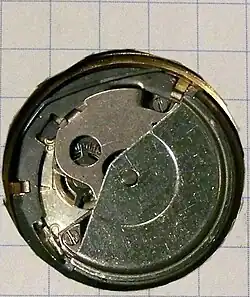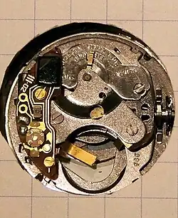 Base movement Model 24 has an oval-rectangular dial plate, and a mostly circular back plate, with a flat at 2:00. Balance is at 5:00. First used in 1963, continued with minor modifications until mechanical production ended.