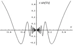 These next two can be tricky to visualize. In this one, we mean that a graph continually rises above and falls below a horizontal line. In fact, it does this infinitely often as you approach a certain -value. This often means that there is no limit, as the graph never approaches a particular value. However, if the height (and depth) of each oscillation diminishes as the graph approaches the -value, so that the oscillations get arbitrarily smaller, then there might actually be a limit.
