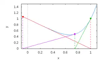 If our intuition was correct and is in fact a better approximation for the root of , then our logic should apply equally well at . We could look to the place where the tangent line at is zero. We call , following the algebra above we arrive at the formula