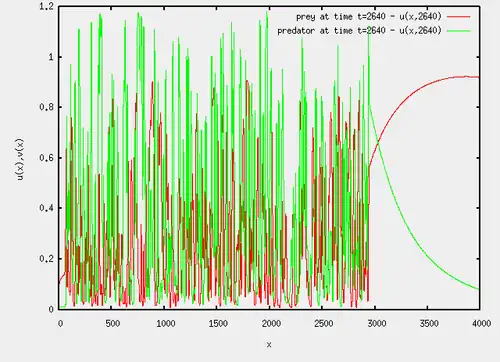 There are two figures showing the system at times 0, 640, 2600. At a certain point in time and space the species distribution becomes chaotic. The chaotic part shows a fast growth.