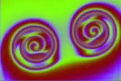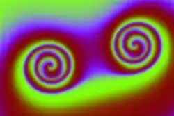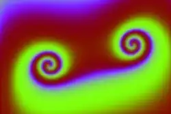 2D dynamics are observed on time points . Spiral patterns can be seen arising from the initial gradient, at the end patterns brake and the system ends in chaos.