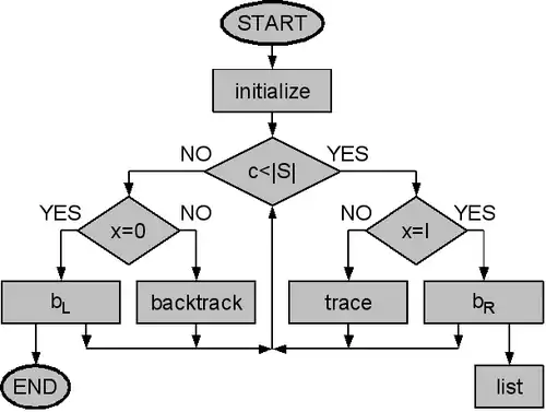 This algorithm traces paths through the preimage diagram. It starts at the first node at the left that is not masked by left boundary conditions. Depending on the position index value and whether there are links to the right there are four options: