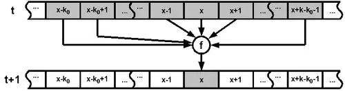 The CA is of higher order if not only the present but past configurations too are used to calculate the future. A second-order local transition function is defined as