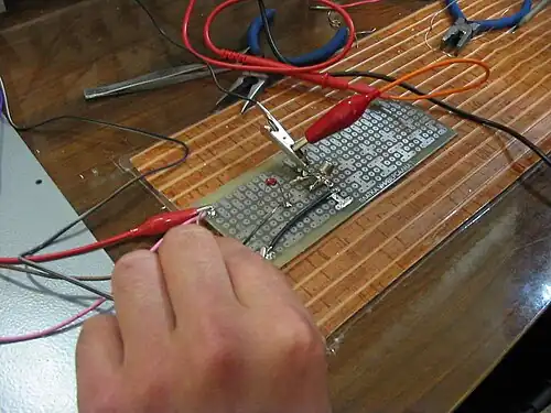 The picture above shows how we have built a transistor switch. It was very interesting task for us. Some of my colleagues took part in this. I watched them with extreme attention. First, the lecturer found a prototyping printed circuit board (PCB), which he gave to us. After that we started building up our "invention". We soldered the supply voltage to the PCB. Then we put n-p-n transistor on the board. It was very difficult to solder its pins... but we made it!
