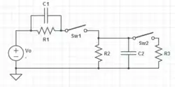 The discharging analysis is capacitive. Going to discharge through the parallel combination of R2 and R3 with an initial voltage of VC2.