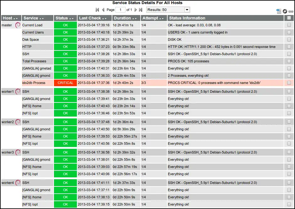 Figure 4.2 shows the service status details for these plugins on the master node. Getting Icinga to monitor remote hosts (the worker nodes) required much more configuration. A look into the configuration folder of Icinga revealed how the master node was configured to display the information of figure [fig:default_plugins]. Information is split into two parts: host identification and service specification. The host identification consists of host_name, address and alias. A service is specified by a host_name, service_description and a check_command. The check_command accepts a Nagios plugin or a custom plugin which has to be configured in another Icinga configuration file: commands.cfg.