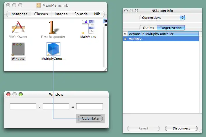 Do the same for the "secondNumber" outlet and the second textfield. And finally connect the right textfield to the "product" outlet. Now we need to connect up the "Calculate" button to the multiply action of MultiplyController. This is also done by control+dragging but this time you start at the button and drag to the class instance. This is because this the message to do the multiplication needs to flow from the button to the controller.