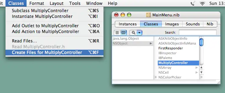 Now that you have your actions and outlets hooked up you can save your work in Interface Builder. But before you leave Interface Builder there is one more thing you should do. Select "MultiplyController" in the "Classes" tab of the "Main Menu.nib" window. and then choose "Create Files for MultiplyController" from the "Classes" menu.
