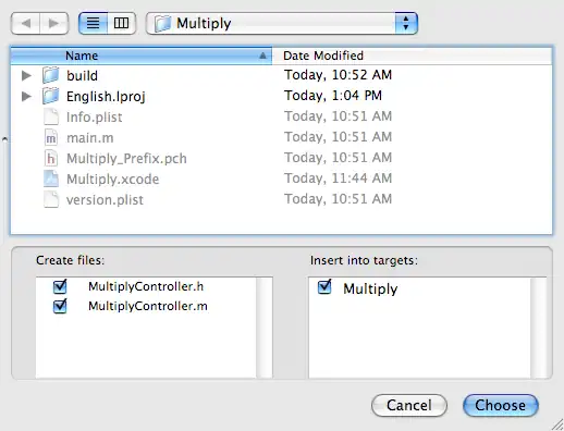In the sheet which appears you should make sure the both "MultiplyController.h" and "MultiplyController.m" are checked then click "Choose"