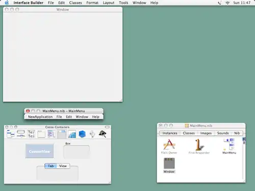 Since your application is going to be quite simple you can jump right in and build the user interface! Click the small arrow next to "NIB files" and double click on "MainMenu.nib". This will start Interface Builder, a helpful program that you use to assemble graphical user interfaces. Once Interface Builder has started you will have windows similar to the following on your screen. Don't worry if the windows look slightly different or are positioned differently.