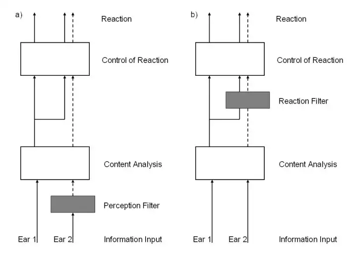 One of the first experiments researching the phenomenon of Attention was the Shadowing Task (Cherry et al., 1953).[4] This experiment deals with the filtering of auditory information. The subject is wearing earphones, getting presented a different story on each ear. He or she has to listen to and repeat out loud the message on one ear (shadowing). When asked for the content of the stories of both ears only the story of the shadowed side can be repeated; participants do not know about the content of the other ear’s story. From these results Broadbent concluded the Filter Theory (1958).[5] This theory proposes that the filtering of information is based on specific physical properties of stimuli. For every frequency there exists a distinct nerve pathway. The attention control selects which pathway is active and can thereby control which information is passed to the Working Memory. This way it is possible to follow the utterance of one person with a certain voice frequency even though there are many other sounds in the surrounding.