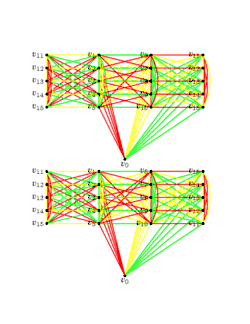 To see that R(3,3,3) ≥ 17, it suffices to draw an edge colouring on the complete graph on 16 vertices with 3 colours, which avoids monochromatic triangles. It turns out that there are exactly two such colourings on K16, the so-called untwisted and twisted colourings. Both colourings are shown in the figure to the right, with the untwisted colouring on the top, and the twisted colouring on the bottom. In both colourings in the figure, note that the vertices are labeled, and that the vertices v11 through v15 are drawn twice, on both the left and the right, in order to simplify the drawings.