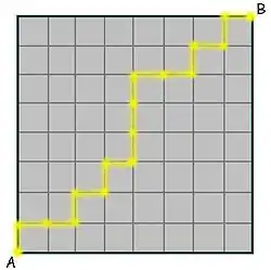 1. Picture a small town center, where the streets form an 8x8 square grid, as illustrated in the diagram. How many ways are there to travel from one corner (A) of the town center to the opposite corner (B)?