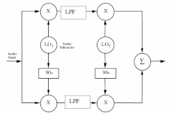 The major difficulty with this technique is the need to provide a constant 90o phase shift over the entire input audio band. To overcome this obstacle, the Weaver or third method uses an audio sub carrier, which is phase shifted.