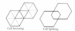 Cell splitting involves the creation of a new smaller cell from two larger ones, while sectoring is the breakup of a single cell into smaller ones. Typically, cell sites are split 3 or 4 to 1.