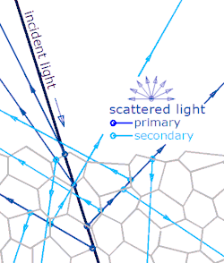 This is the most common form of reflection. If the illuminated object is not microscopically homogeneous in its structure, the light is scattered in all directions by multiple reflections or diffusions by its inhomogeneities (both internal and on the surface). Most materials are inhomogeneous: minerals are generally polycrystalline, organic matter is generally made by cells or fibers, so the light sent to our eyes by most objects is diffusely reflected. Because of this phenomenon, we can see other objects.