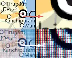 A pixel is one square that represents a color or shade in a mosaic. The larger mosaic image is called a bitmap. A map of bits. The most simple form of bitmap image, an uncompressed two color black and white mosaic, is transmittable as a series of zeroes and ones in computer code, where the only raw data needed additionally is the length of each line of pixels. If you shrink a large image, represented on the screen as a mosaic of 2000 by 2000 squares across, down to 3 by 3 squares, you get an nine squares of color. Everything else is lost, and if you scale it up again, you just have the nine squares, in varying sizes.